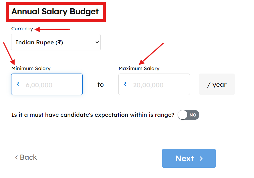 STEP 6 - Type your budget to hire, from min to max. Select your currency and read turn on the toggle if it is a must have skill that the candidate comes within that budget only, toggle off if you are flexible with the budget.