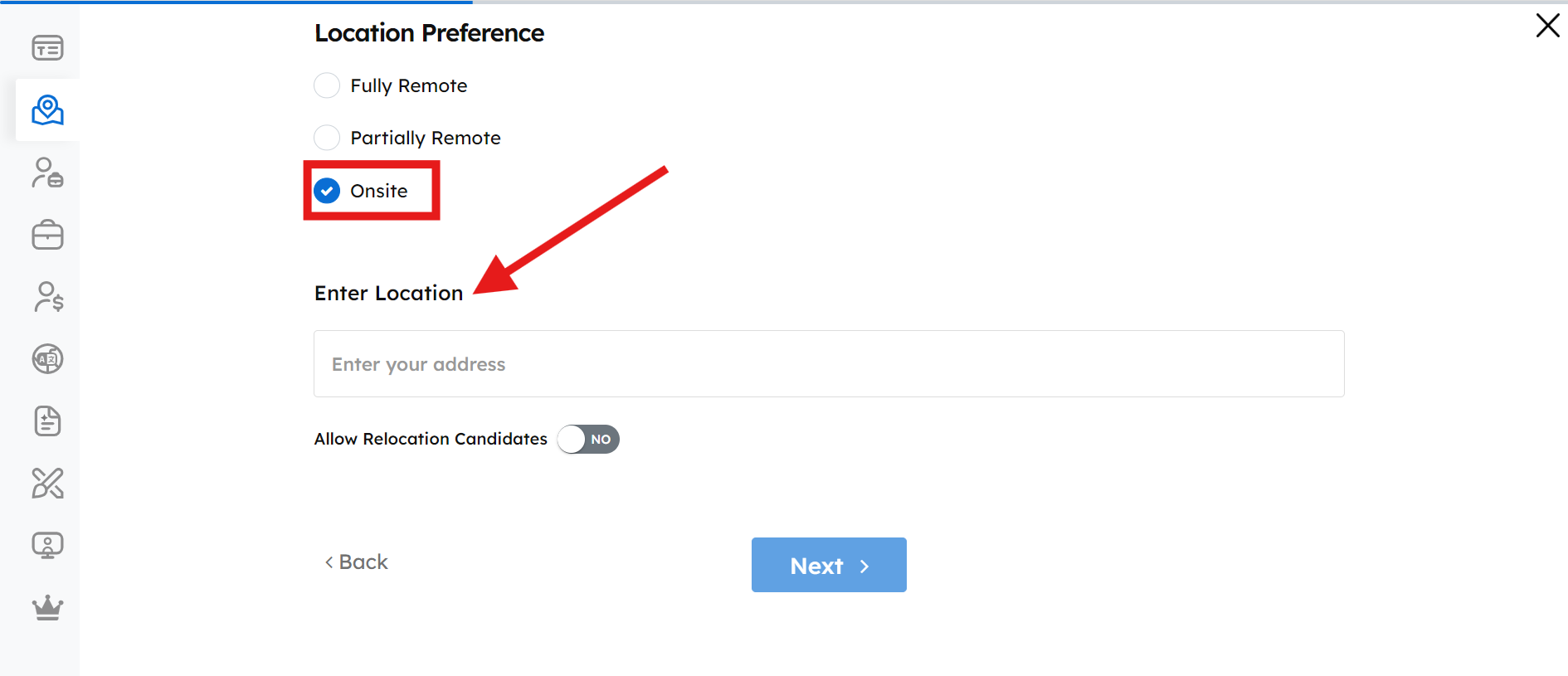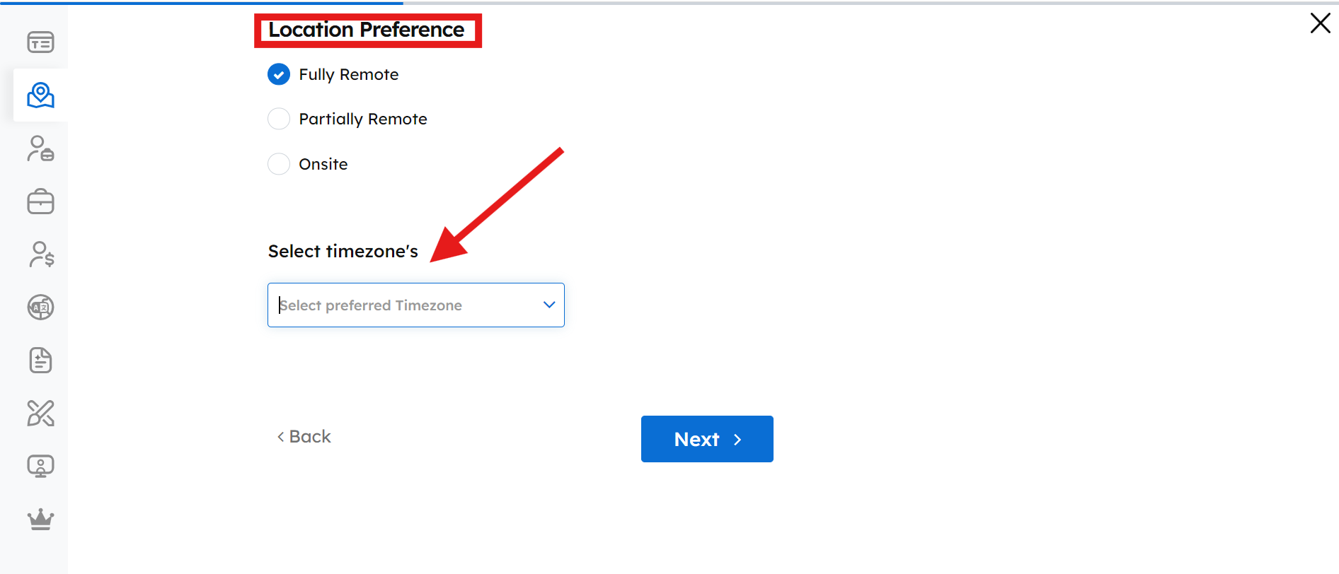 STEP 3 - Enter your location preference. If you are hiring remotely, select the time zone. If you are hiring on-site, select the location. If you are okay for relocation candidates toggle on.