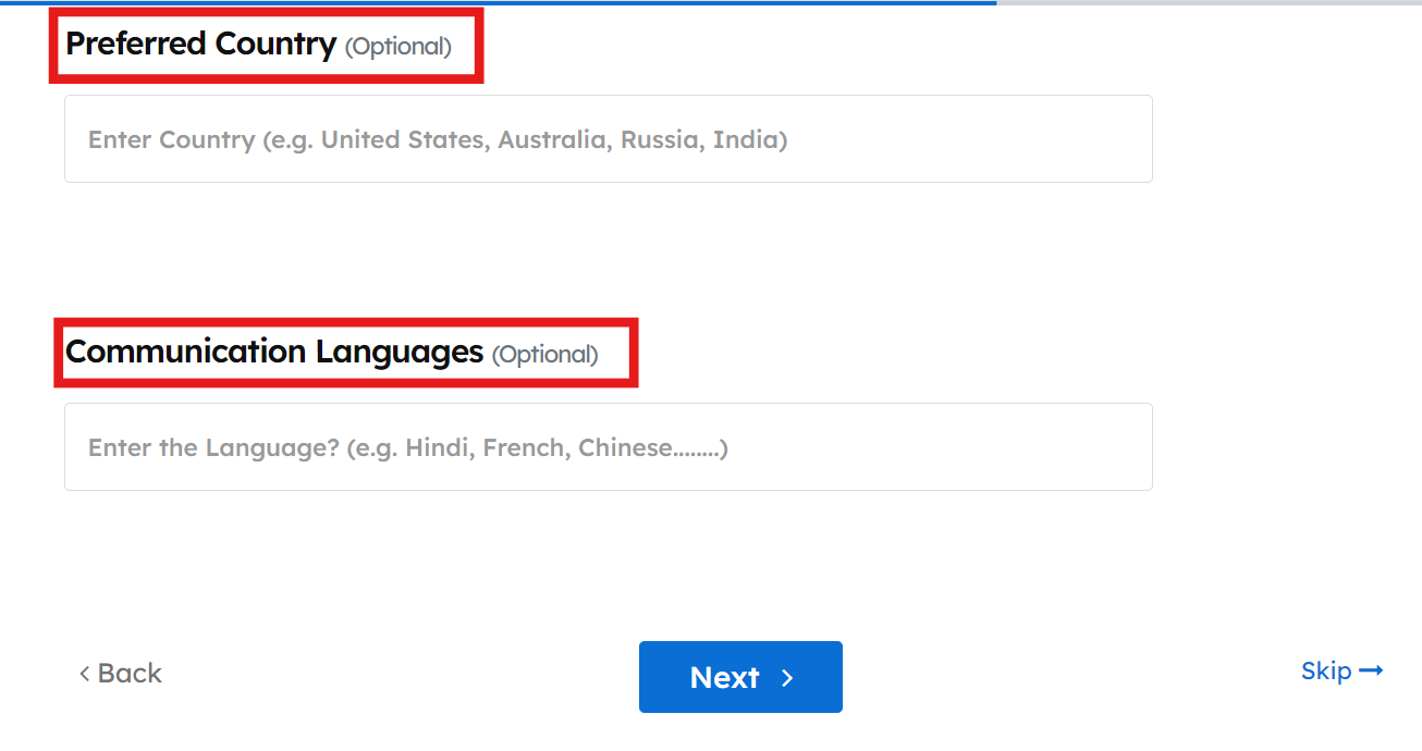 STEP 7 - Two optional steps are provided. You can select the country you are hiring out of and the languages you wish for the candidate to speak.