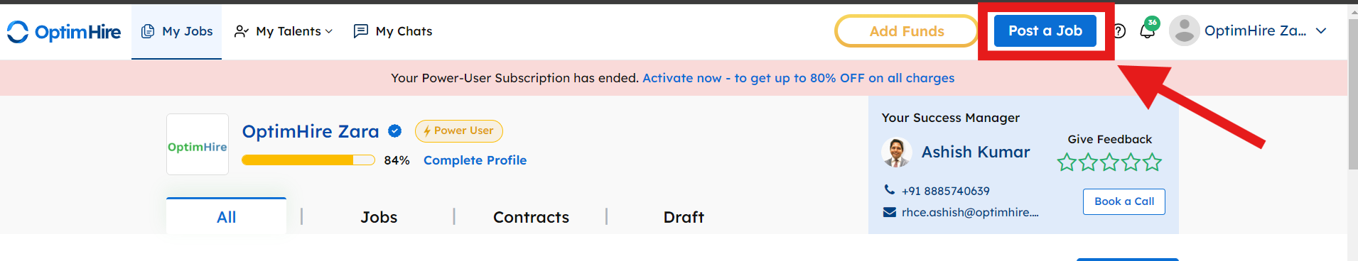 STEP 1 - Login to your OptimHire Account, you will be directed to the “My Jobs” page. On the top right hand side you will find a “Post a Job” button. Click on that.