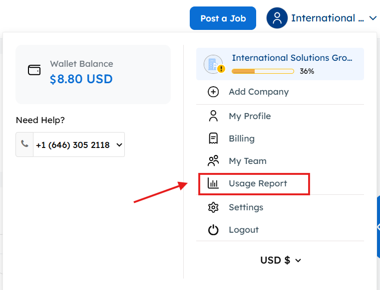 Access Usage Report – To get to the credit usage report, click on your name/company name on the top right. You will get a menu list, click on the  usage report.