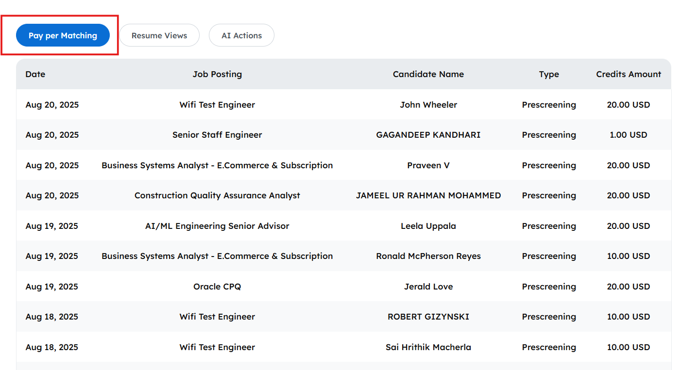 Pay Per Matching – In this tab you will find a list of all the matching candidates pre-screened by our AI recruiter. You can see that the list is  divided in sections of dates, job posting title, candidate name, and credit amount.