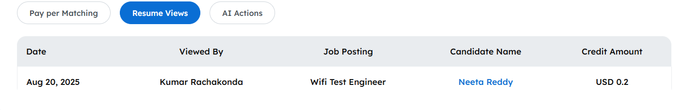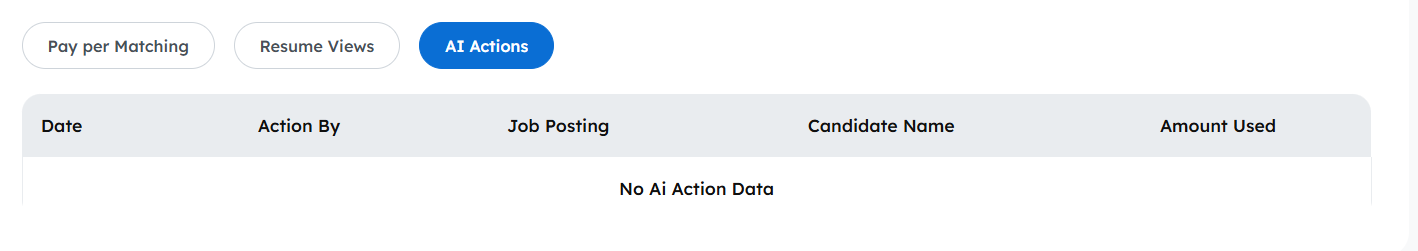 AI Actions – If you have used  your credits to invite and screen a candidate to apply to your job, you can view it by clicking the AI Actions button. You can see that the list is divided in sections of dates, job posting title, candidate name and credit amount if applicable.