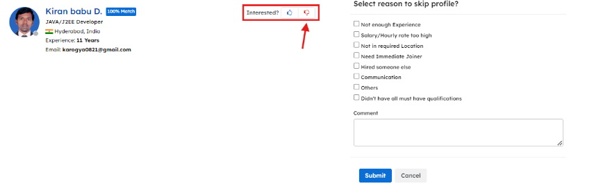 Skip Profile – You can easily skip the profile if it does not meet the criteria. Just click on the thumbs up button next to the word interested and select the reason for skipping the candidate and the stage will automatically change.