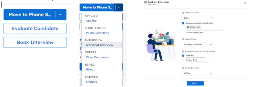 Next Step of Candidate – You will see 3 options on the right hand side of every candidate profile named as, “Move to, Evaluate Candidate & Book Interview” you can either move the candidate to the next step, evaluate the candidate for the current stage and how they performed or book an interview from the platform itself.