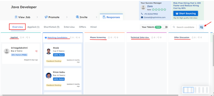 Overview Stage – The “Overview Stage” will give you an overview of all the profiles in their respective stages. You will find all the stages such as “Applied, Matching Candidates, Phone Screening, Technical Interview, Offer Discussion ect.” These stages are customizable when you make the job posting or you can just click the little setting button on the left side. You can easily add more stages according to your rounds of interview.