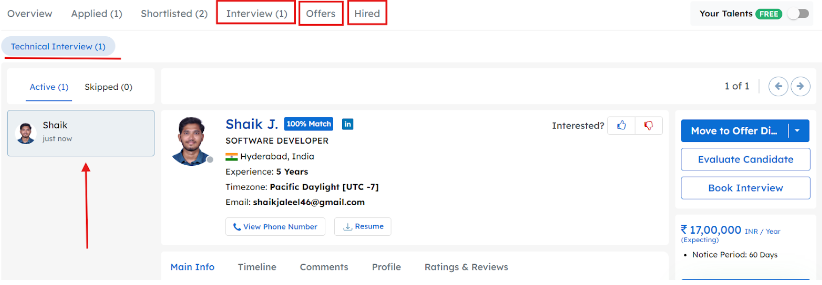 Interview, Offers, Hired Tab – These tabs are utilized for keeping the candidates in their respective stages. You can move the candidates to Offered or Hired after the interview is completed.