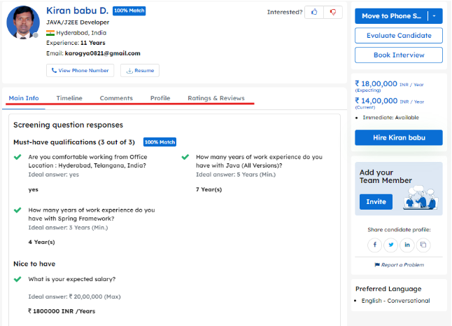 Profile – You will find everything about a profile in the tabs “Main Info, Timeline, Comments, Profile along with Ratings & Reviews” In Main Info, you will find how the candidate answered your screening questions and if you scroll down you will find their original resume. In Timeline, you will be able to see the timeline of the candidate and history of their movement in the ATS. In the Comments tab, you can view the comments of anyone from our team giving you more info about the candidate or a phone call recording. Here you can add your own comment as well about the candidate. In the Profile tab, you will see the entire profile of the candidate like previous work history, projects worked, education, etc. In Ratings and Reviews, you will find any ratings that previous employees had given this candidate or you can write your own review as well.