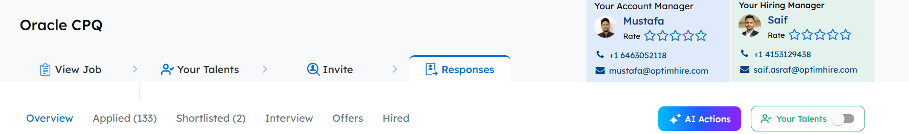 Find the Response – On the top left you will find the name of your job posting and the tab marked as “Response” will take you to the Response tab. It will have stages marked as “Overview, Applied, Shortlisted, Interview, Offer & Hired.”