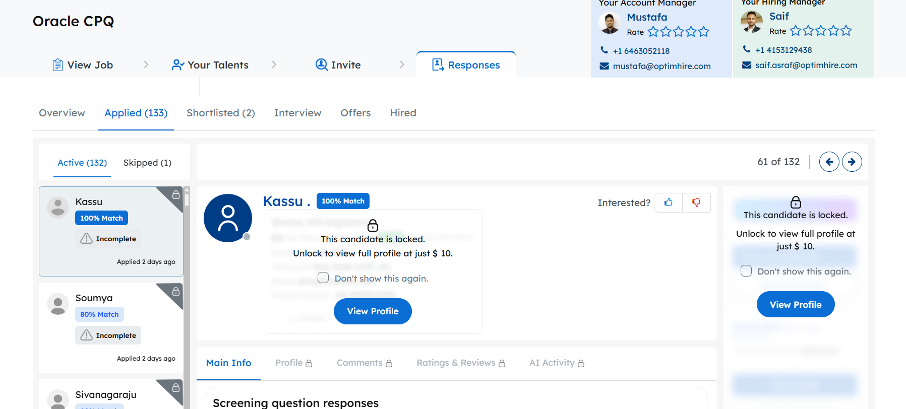Applied Stage – This stage is for all the candidates who have applied to your job which have been pre-screened. When you click on their profile you can see how they preformed in you prescreening round and if they are matching or not. If the candidate is above 50% matching it will cost $20 and if its below 50% matching it will cost $10. Any candidate who have an “Incomplete” tag on their profile will cost $10 as they have not answered all the questions.