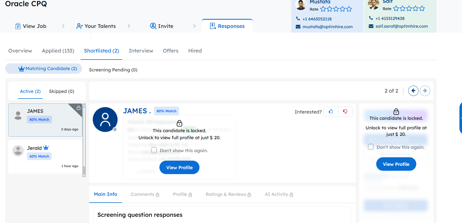 Shortlisted Tab – In this tab, you will have two stages, “Matching Candidates & Phone Screening” The Matching Candidates stage is where our AI Recruiter will submit profiles that match your requirement. You can view all the matching profiles and move them to the next stage or simply skip them. If you have called the candidate, you keep them in the Phone Screening stage. These profiles will be above 50% matching and will be locked, you can view whichever one you please.